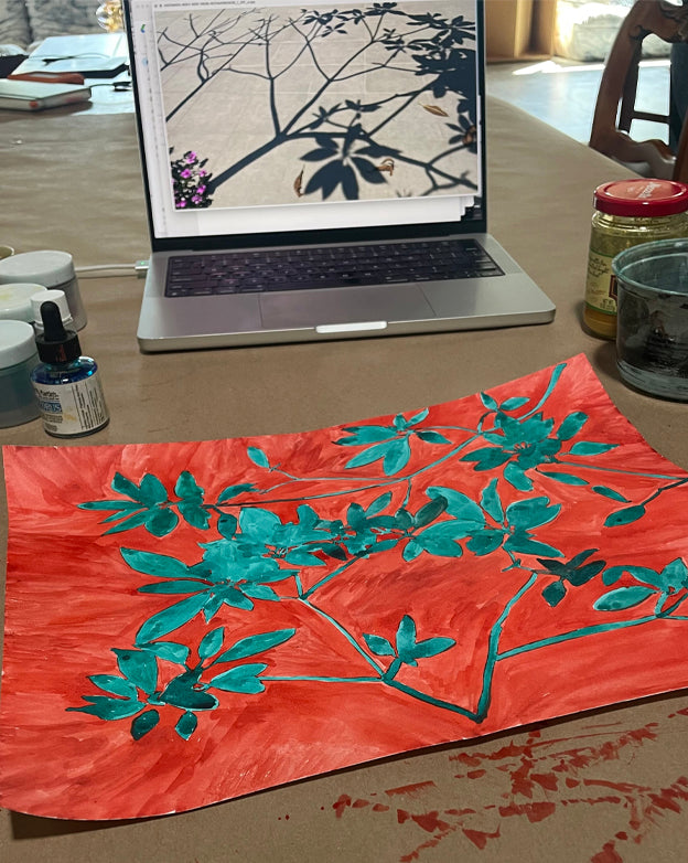 Tropical branches casting strong shadows on a stone surface at midday inspired the Plumeria Shadows pattern, a new watercolor design conceived by Eskayel founder Shanan Camanaro.