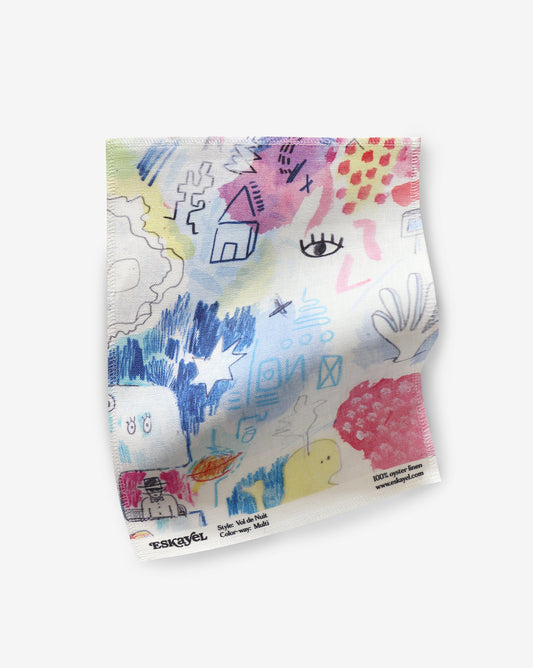 Designed from his enchanting artwork, Gordon’s Vol de Nuit is a pattern that immerses us into a dream world of characters, locations, poetry, and language. The seemingly random pieces hidden within the work merge to create an uplifting, imagined narrative. “I want to make something that every time you look at it, you notice something new.”