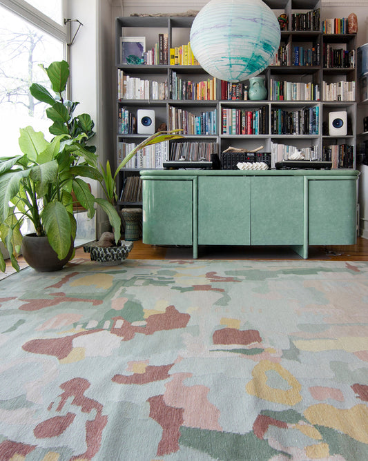 The Jamaa Murals Collection was designed from original artworks painted by founder Shanan Campanaro and artists Briana DeVoe White and Olivia Provey while working at the Eskayel studio. Derived from photographs of Morocco, each painting showcases different versions of the same theme. The designs reflect a softened interpretation of the geometric cityscape of Marrakech with a palette inspired by both city and desert.