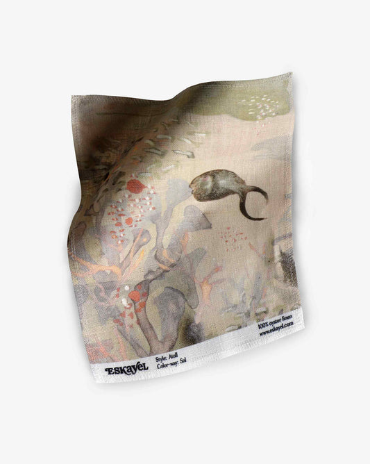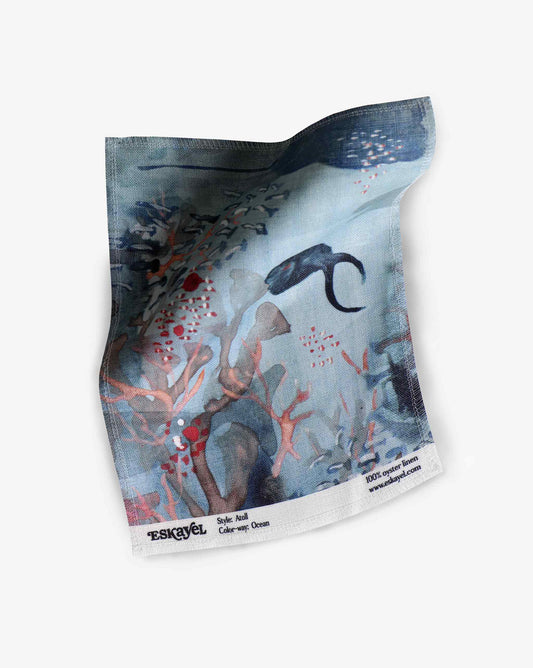 Nalediva is a collection capturing vibrant vistas from the Maldives glimpsed underwater and overhead. Inspired by sea creatures, coral habitats, and cloudscapes, the designs are Eskayel’s first to be printed on 100% paper backed silk — a fitting finish for the fluid, dreamlike quality of these compositions.