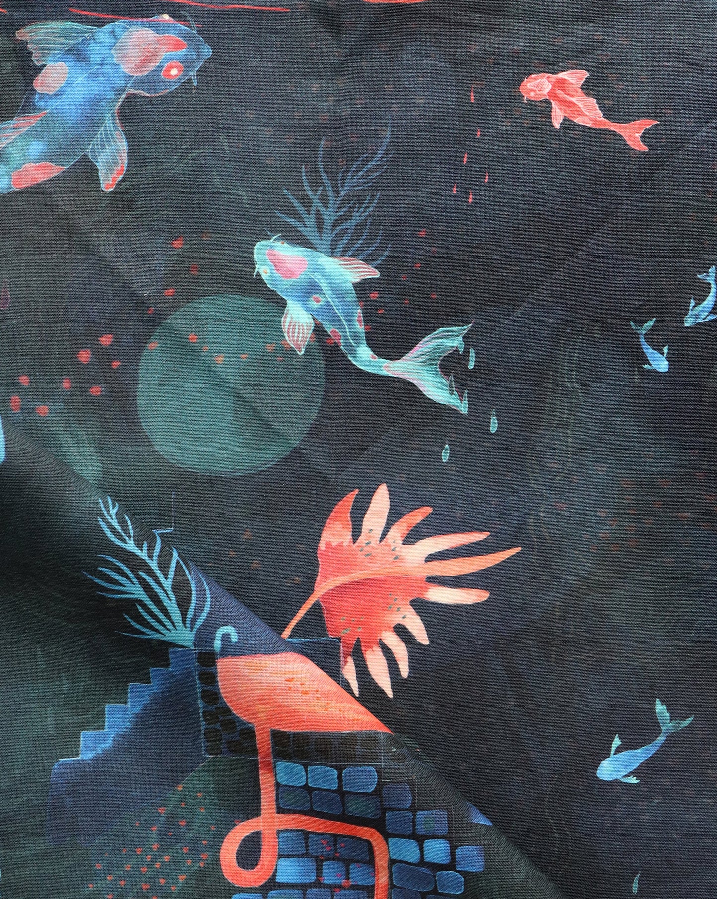 Water Signs, a high-end wallpaper and fabric, was created in collaboration with Olivia Provey. The pattern derives from a series of paintings exploring Olivia's attraction to water. Celebrating the power of water and its ability to heal and transform us, the surreal, artistic pattern is layered with dreamy motifs including fish and underwater plants. It is available in five colorways. Turquoise is a dark blue-green colorway with vibrant pops of magenta, light blue, and green.