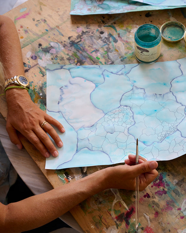 The patterns stem from the long tradition of lace making in Italy, home of Eskayel founder Shanan Campanaro’s ancestors. While old Italian lace followed regimented construction along grids, these new designs are based on Shanan’s watercolor paintings and their signature relaxed feel.